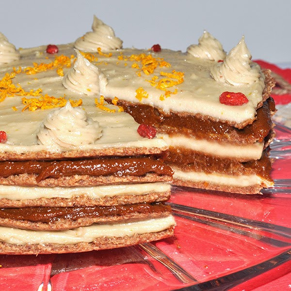 Уникален вкус от бадемови блатове, крем от сурово кашу и вкусни кайсии, овкусени с канела, портокалова и лимонова кора.